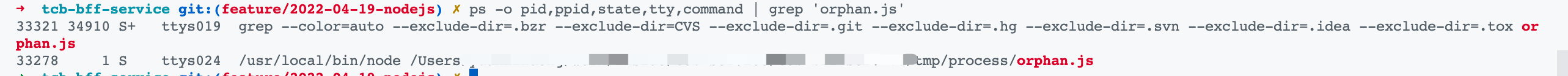 启动后,通过 ps -o pid,ppid,state,tty,command | grep 'orphan.js' 查看结果,可以看到33278的ppid已经变成1,托管给了init进程: